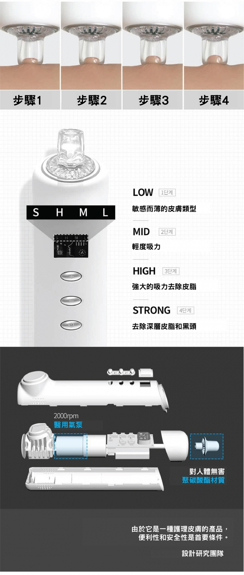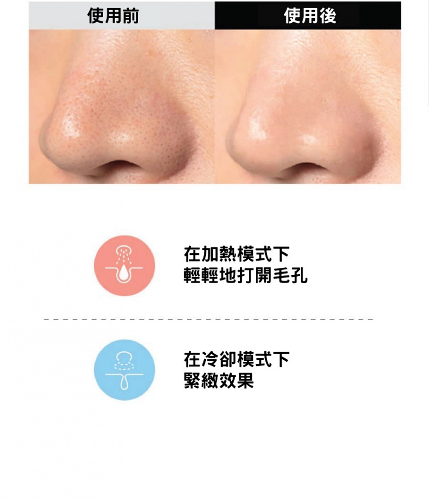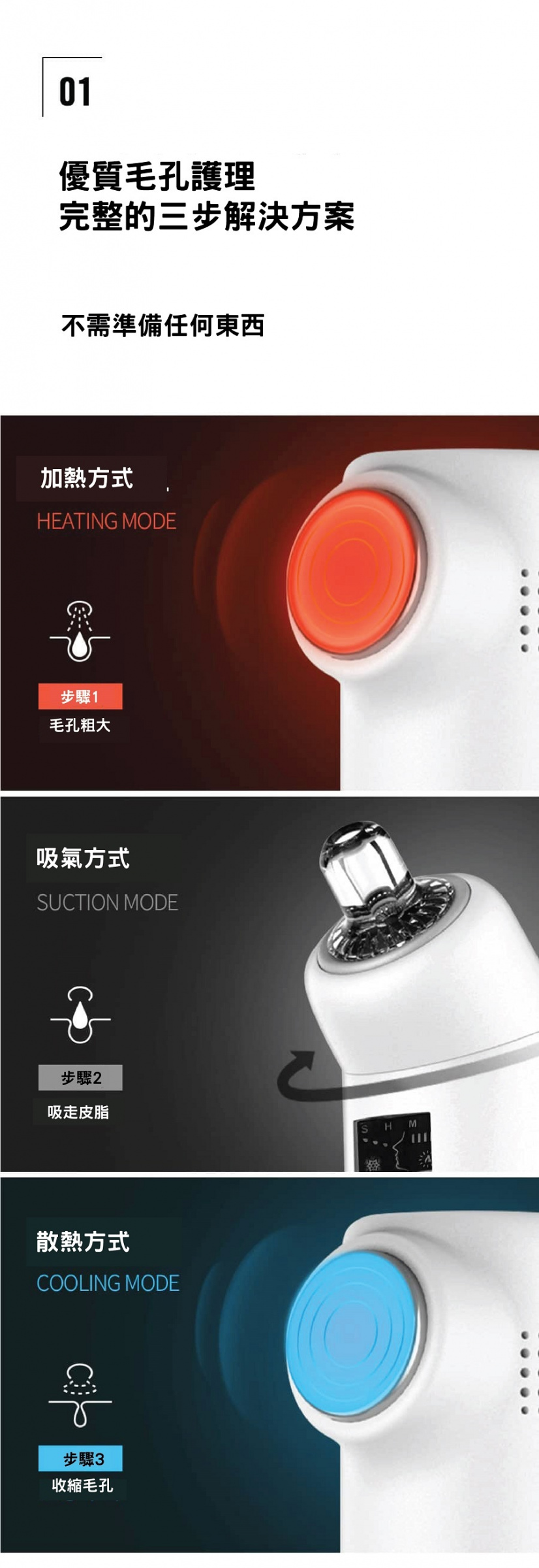 四步解決皮膚多種問題,首先加熱令毛孔打開,通過調節好的力度吸走黑頭、粉刺、油脂等,最後轉換成冷卻,使張開的毛孔回復緊緻。