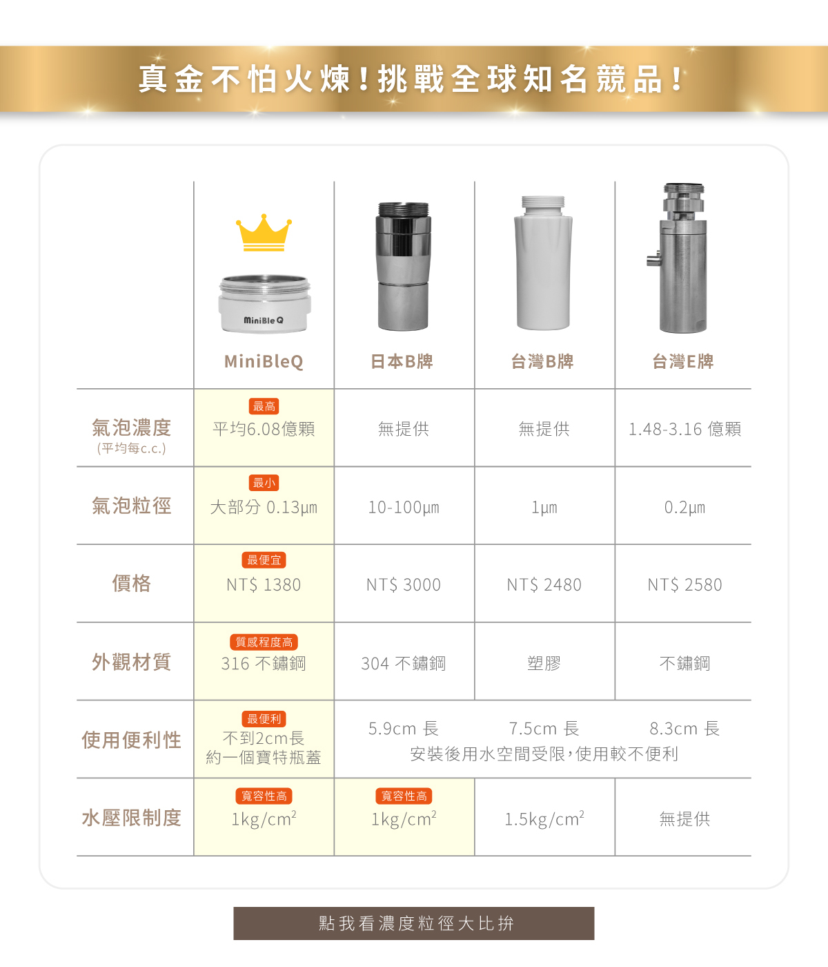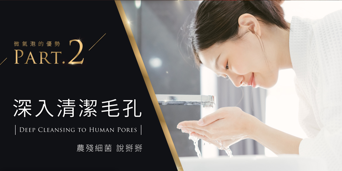 三倍清潔,令水氣泡1/500大小,經SGS 及多個檢測,每c.c 可去除5萬隻大腸桿菌等等細菌。