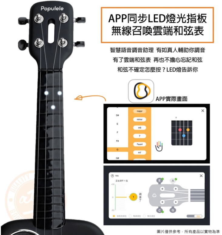 琴身採用T700碳纖維材質,不但耐用,防水,輕量,而且彈奏出黎既聲音比普通烏克麗麗更清脆,配合Populele手機App,內置調音助理,遊戲學習法,LED和弦指導燈,自學人士都唔駛擔心出現錯誤,更可在遊戲中學習
