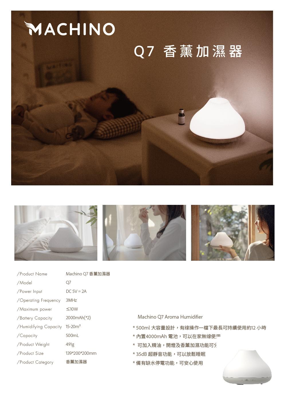 隨時隨地可以減低室內乾燥,滋潤皮膚,令你更放鬆自在!MACHINO Q7香薰加濕器可以不插電使用的一款加濕器,可以放屋企任何位置。配合最新技術,做出微細水霧,有效減低室內乾燥,細微水份的釋出,配合柔和LED 燈,加入精油更可以舒緩疲勞,超寧靜操作(最低僅35分貝),伴你工作或休息,讓您一夜好眠。內置4000mAh 鋰電池。方便旅行攜帶,時刻保持濕潤舒適