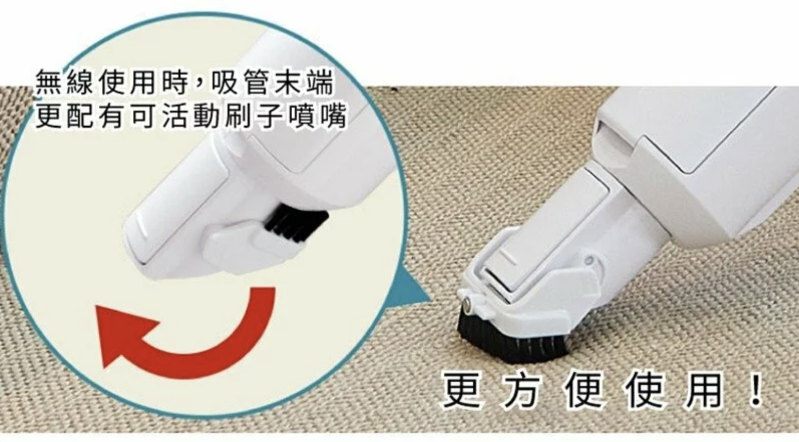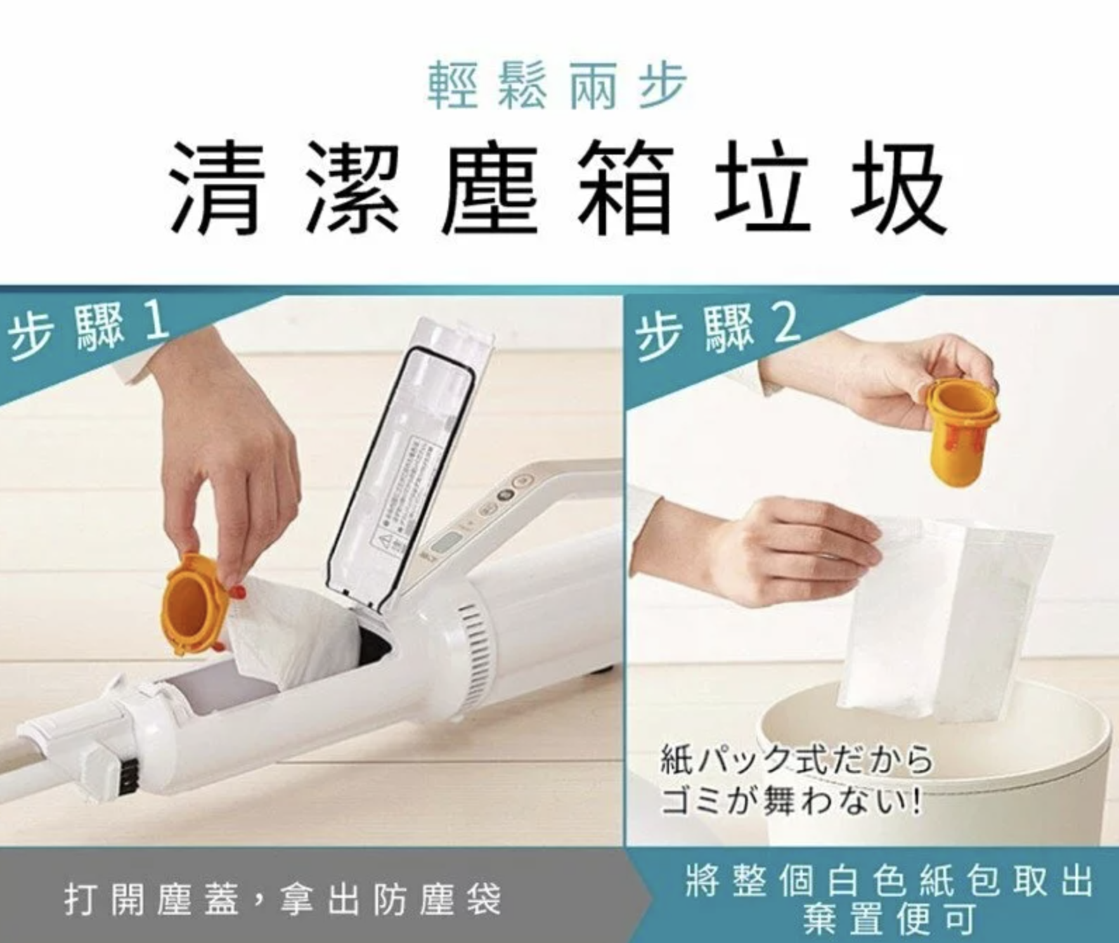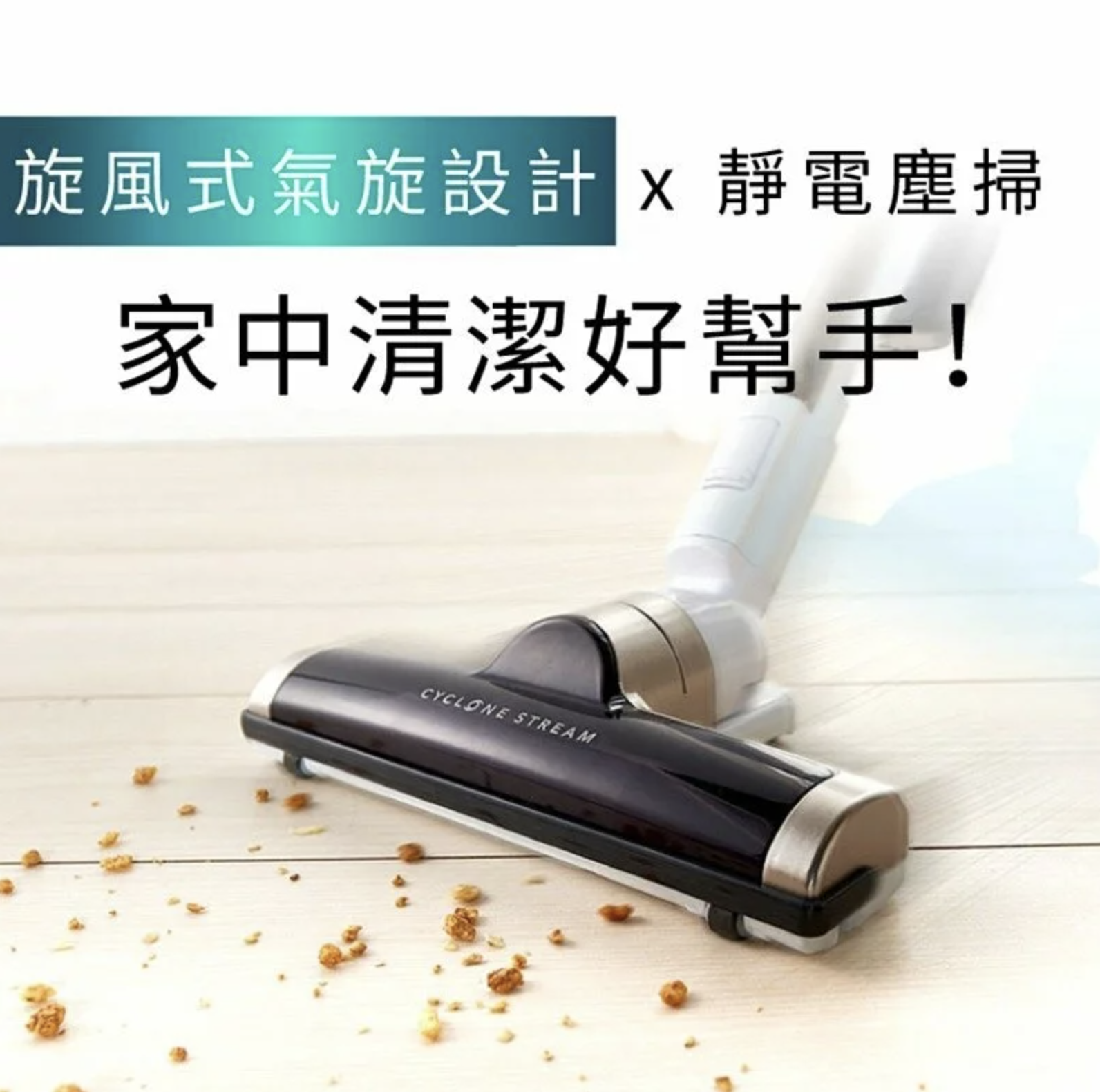 改良式氣旋吸頭、吸頭款度增加2cm,智能感應模式、自動調節「強力」+「節能」模式。 貼心牆面固定架,可壁掛式收納設計,輕巧不占空間。 銀離子集塵袋 抗菌、除臭。另外更增加了靜電塵掃,方便掃走垃圾。