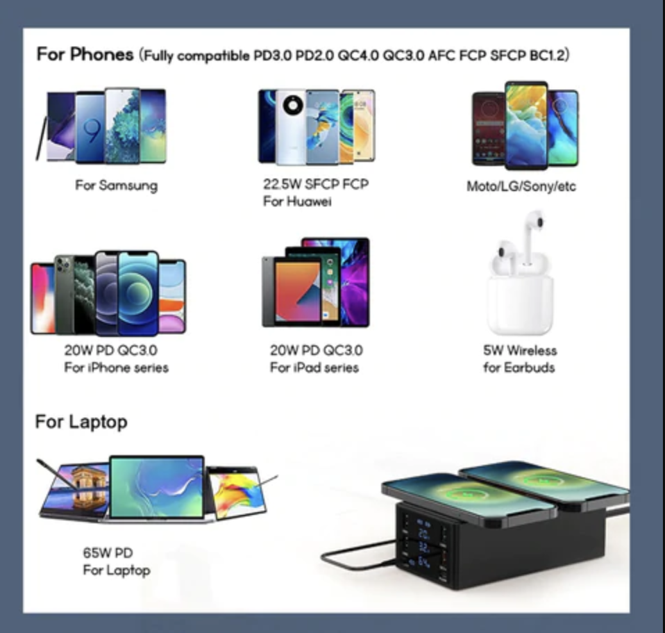 150W超強功率,兼容多種快充協議,支持多口同時快充,PD65W支持筆記本電腦快充,PD20W支持蘋果12快充,QC3.0支持22.5W。