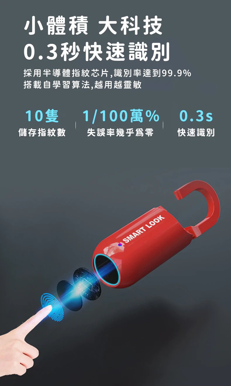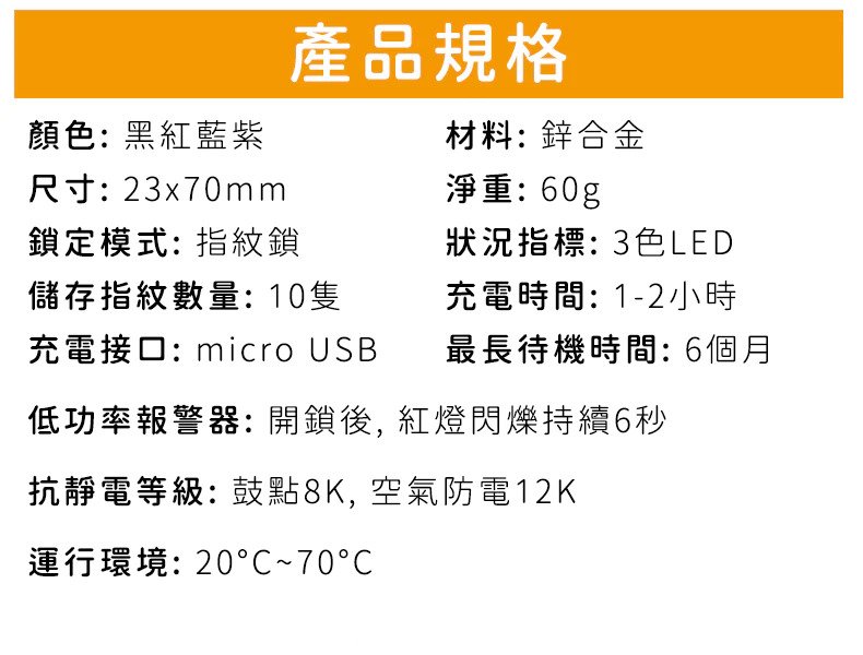 材料: 鋅合金淨重: 60g尺寸: 23x70mm鎖定模式: 指紋鎖儲存指紋數量: 10隻狀況指標: 3色LED充電接口: micro USB充電時間: 1-2小時最長待機時間: 6個月