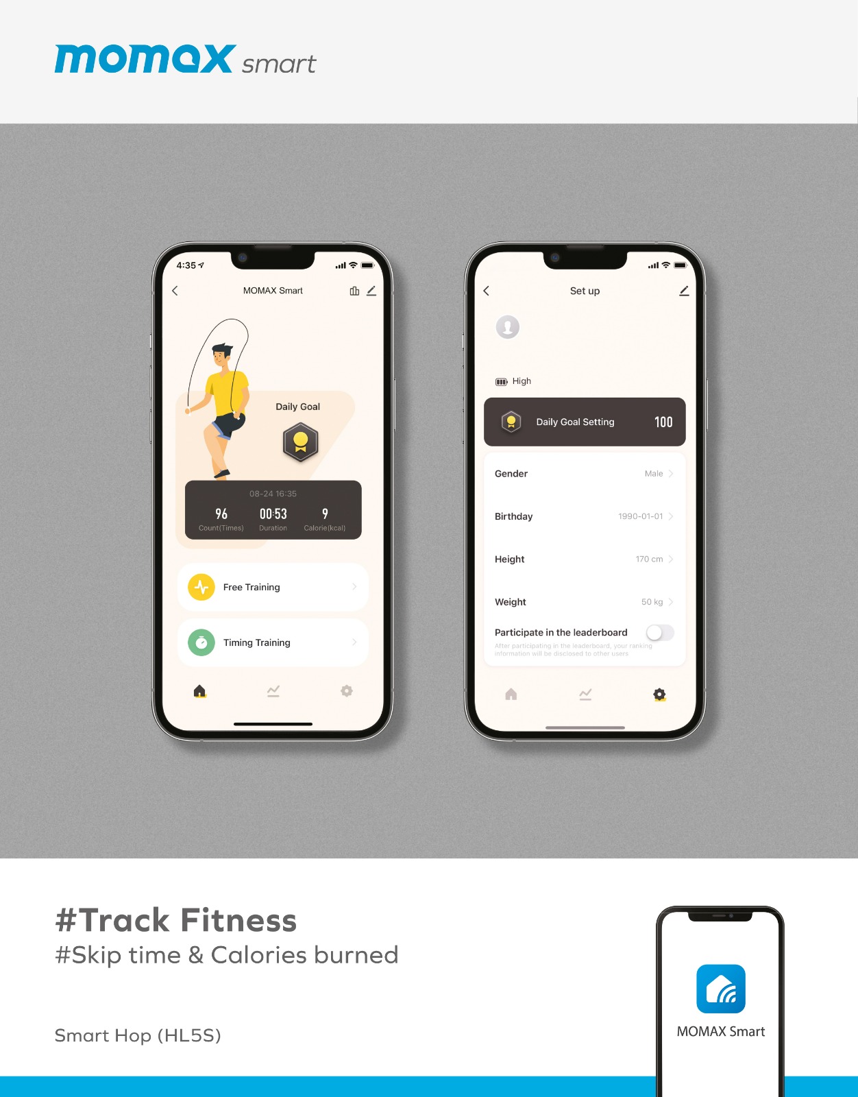 配合MOMAX SMART App可記錄和分析跳繩數據以進行健康管理