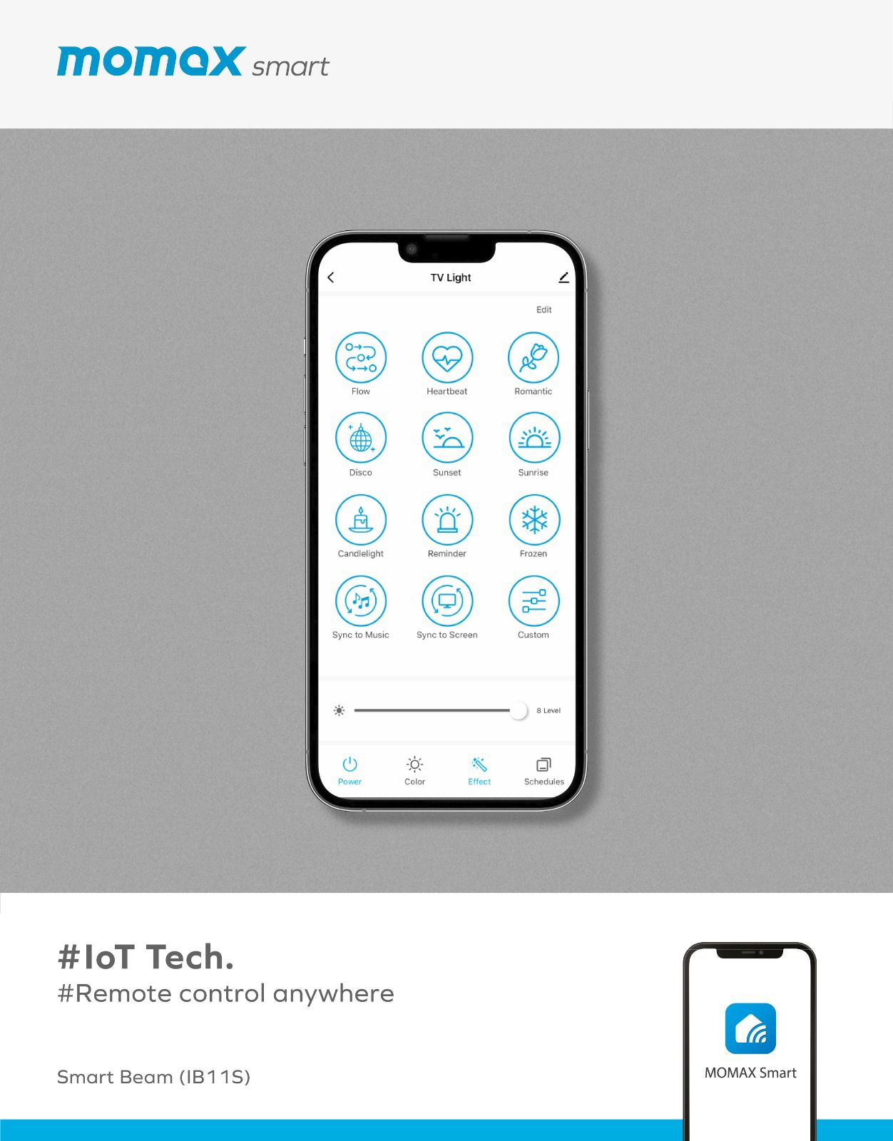 可使用MOMAX Smart App控制彩燈效果、色溫、光度和場景