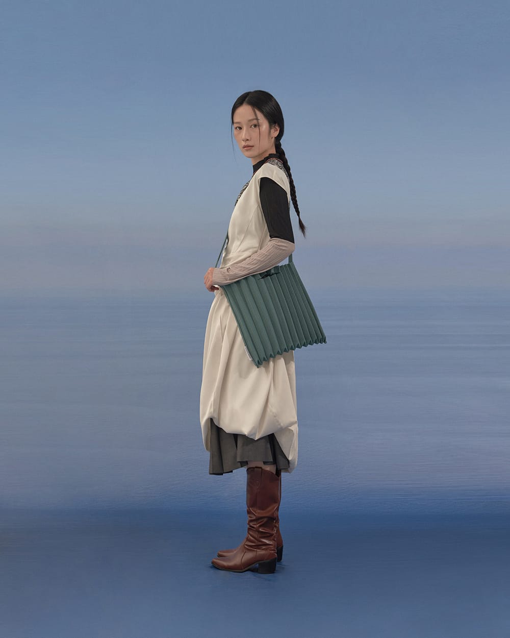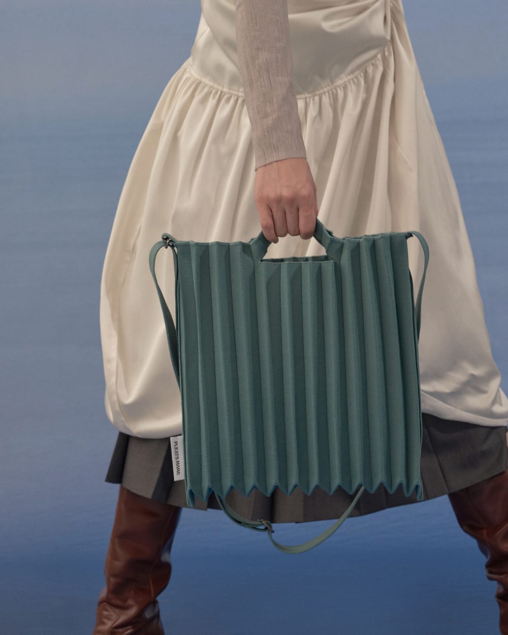 這是PLEATS MAMA推出的第一款回收廢舊漁網尼龍產品,採用了PLEATS MAMA傳承下來的針織褶皺設計。