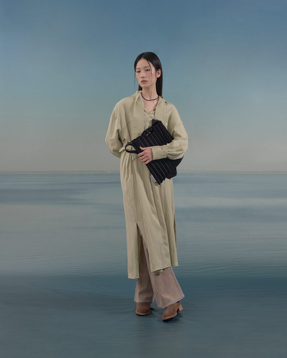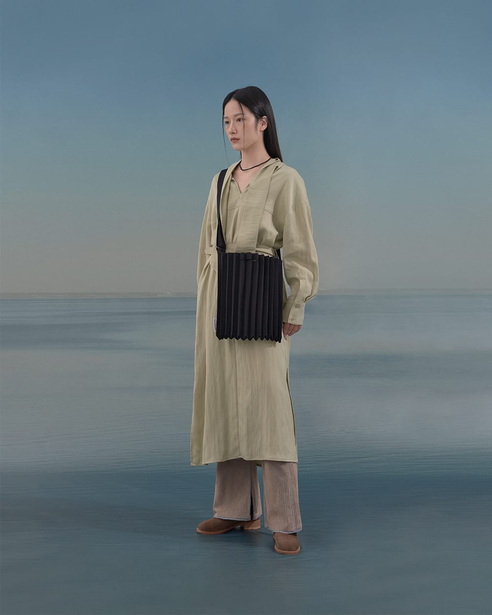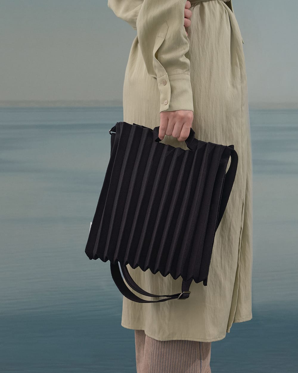 這是PLEATS MAMA推出的第一款回收廢舊漁網尼龍產品,採用了PLEATS MAMA傳承下來的針織褶皺設計。