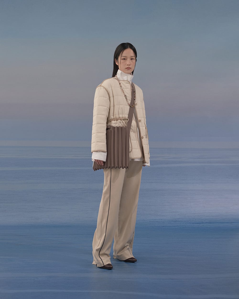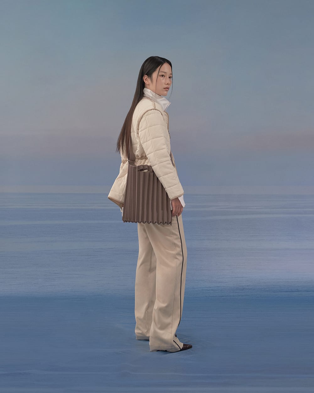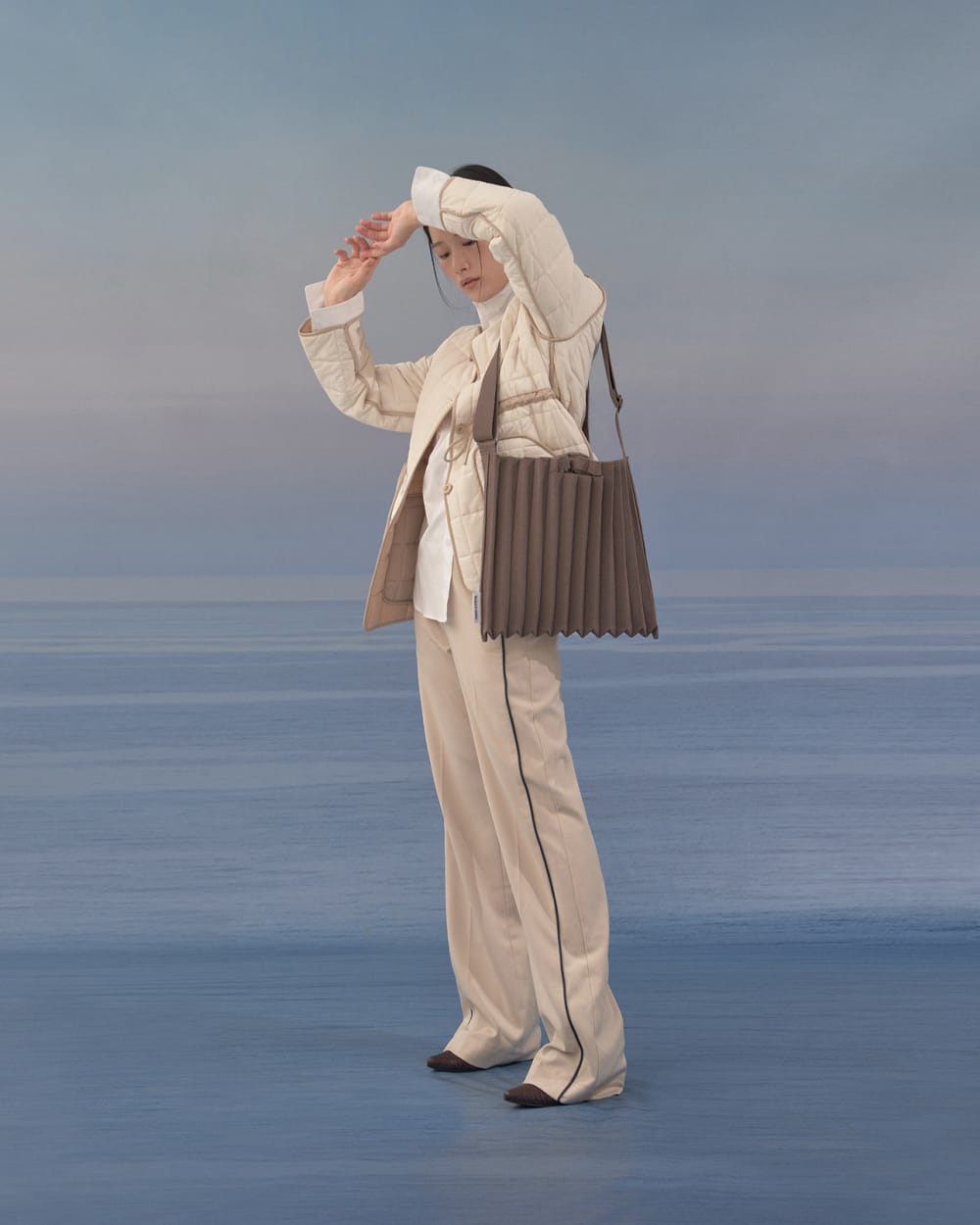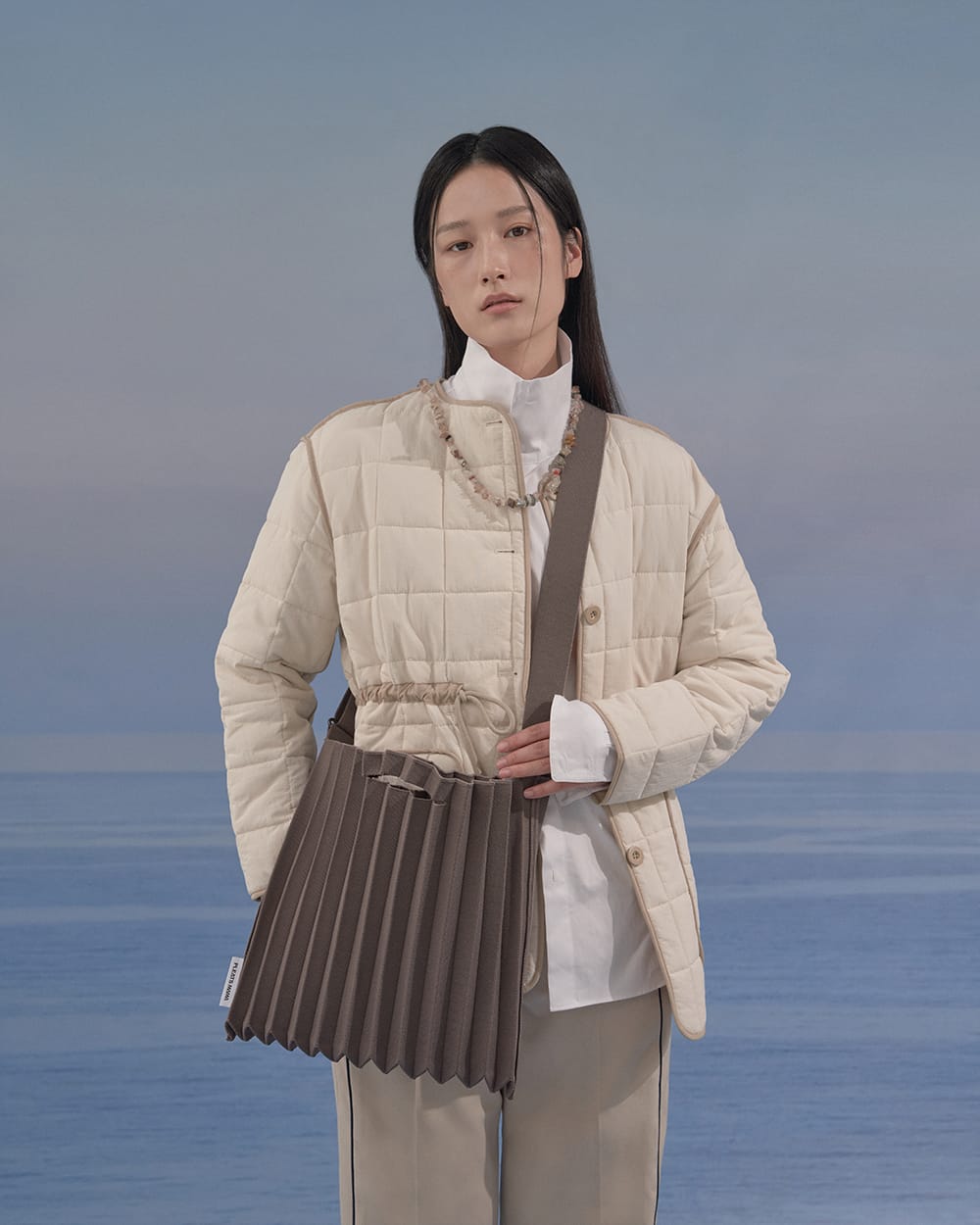 這是PLEATS MAMA推出的第一款回收廢舊漁網尼龍產品,採用了PLEATS MAMA傳承下來的針織褶皺設計。